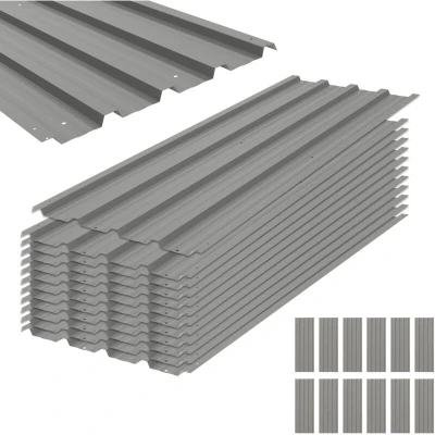 General description This pack of 12 galvanised steel panels from Outsunny is designed to repair and strengthen isolated spots as needed. Made from tough steel, these corrugated roofing sheets provide reliable protection wherever required. They can be easily cut into the desired shape, and the pre-drilled holes facilitate quick installation. Technical specifications Colour: Light Grey Material: Galvanised Steel Each Panel Dimensions: 129L x 45W cm Thickness: 0.25 mm Item Label: 84H-021V00LG Usage Can be used as external cladding for wall and roof partitions on sheds, carports, greenhouses, or garages. Weather-resistant and low-maintenance.