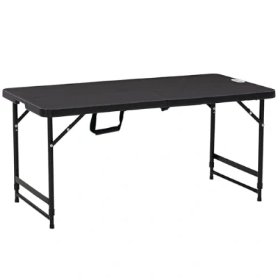General description A simple and portable piece for outdoor dining, the Outsunny folding dining table comfortably accommodates four people. Its foldable design with a handle allows for easy carrying and storage. Technical specifications Colour: Dark Grey, Black Material: Steel, HDPE Overall Dimension: 118L x 60W x 74H cm Folded Dimension: 61L x 60W x 8H cm Adjustable Height: 56 cm, 74 cm Top Thickness: 3.8 cm Weight Capacity: 60 kg Item Label: 84G-005V00CG Usage Table height adjustable between 56-74 cm Durable tabletop made from plastic Easy to clean with a damp cloth No assembly required