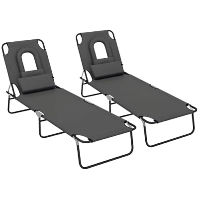 Outsunny Folding Sun Lounger Set of 2 Reclining Chair with Reading Hole Grey