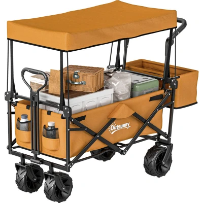 Outsunny Folding Trolley Cart Storage Wagon Beach Trailer 4 Wheels with Handle Overhead Canopy Push Pull For Shopping Camping, Orange