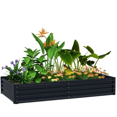 This Outsunny vegetable planter boasts is 30 cm deep and holds up to 459 L of soil - plenty of room to grow flowers, vegetables and other plants. A tough galvanised steel structure, with a powder coating for extra strength, the veg planter offers resistance against rust and weather damage. The open bottom design means direct soil contact for lots of natural growth, without any damaging water build-up. Specifications: ● Colour: Dark Grey ● Material: Galvanised Steel ● Overall Dimension: 180W x 90D x 30H cm ● Planter Inner Size: 178W x 86D x 30H cm ● Item Label: 84H-211V00CG Features: ● 180 x 90 cm, with 30 cm depth: hold and grow plenty plants, vegetables and flowers ● Galvanised steel frame for long-time use, with a powder coating for extra strength and protection ● Inner support bars and corner sheets for added protection ● Open bottom design: direct soil contact and no water build-up ● Won't cut yourself on the corners ● Easy to assemble. Always wear gloves during installation