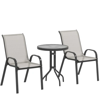 Simple, stylish outdoor garden furniture for relaxing or dining with this Outsunny patio set. It comes with a round table and four chairs to sit outdoors with company the chairs are stackable to save space when not being use. Powder coated steel frames mean strong, tough cores on the patio table and chairs, suitable for outdoor use. Specifications: ● Colour: Light Grey ● Material: Steel, Texteline (100% Polyester), Tempered Glass ● Table Dimension: Φ60 x 71H cm ● Armchair Dimension: 54W x 71D x 93H cm ● Seat Size: 44.5W x 45D cm ● Seat to Floor Height: 43 cm ● Back Size: 44.5W x 58H cm ● Weight Capacity: 120 kg (chair), 50 kg (table) ● Item Label: 84G-682V00BK ● Note: Use a furniture cover to extend the service life of this set Features: ● Three-piece set: includes two chairs and a round table ● Stackable chairs: save space when not being used, easy to store ● Tempered glass tabletop with water ripples is safe, smooth and easy to clean ● Powder coated steel pieces are strong, with