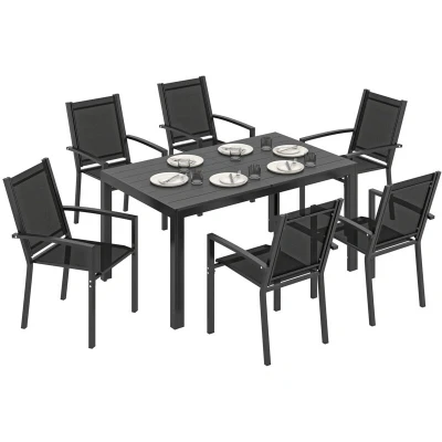 Whether it's for breakfast, brunch or dinner, this Outsunny seven-piece garden dining set brings everyone together. Six stackable chairs to sit with your favourite people, with the large table giving plenty of dining room. Made from plastic wood composite board, the tabletop is strong and low-maintenance. Our garden table and chairs are suitable for outdoor use: the teak-effect design is an excellent addition to outdoor spaces. Specifications: ● Colour: Black, Dark Grey ● Material: Steel, Breathable Mesh, Plastic ● Table Dimension: 150L x 90W x 73H cm ● Armchair Dimension: 58W x 63D x 86H cm ● Stackable Chairs Dimension: 58W x 85D x 110H cm ● Back Dimension: 49L x 49W cm ● Seat Dimension: 50W x 51D cm ● Seat to Floor Height: 45 cm ● Weight capacity: 120 kg (chair), 70 kg (table) ● Item Label: 84G-404V01BK ● Note: Use a furniture cover to extend the service life of this set Just so you know: this item ships and arrives in separate boxes. Delivery times may vary with each box. Box