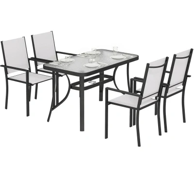 Your small patio feels empty, a missed opportunity for family meals on warm evenings. The summer heat can make patio furniture set uncomfortable, cutting precious moments short. This Outsunny five-piece garden table and chairs set transforms your space into an inviting retreat. Breathable texteline chairs offer cool comfort. The elegant Water-ripple glass-top table even features an umbrella hole, letting you create cherished memories in shaded comfort with this outdoor furniture set. Specifications: ● Colour: Light Grey, Black ● Material: Galvanised Steel, Texteline, Tempered Glass ● Table Dimension: 120W x 68D x 72H cm ● Chair Dimension: 54W x 62D x 89H cm ● Stacking Chairs Dimension: 55W x 80D x 99H cm ● Seat Dimension: 42W x 50D cm ● Seat Height: 43 cm ● Backrest Dimension: 50W x 49H cm ● Weight Capacity: 120 kg (chair), 50 kg (table) ● Item Label: 84K-108V00LG Just so you know: this item ships and arrives in separate boxes. Delivery times may vary with each box. Box quantity: 2