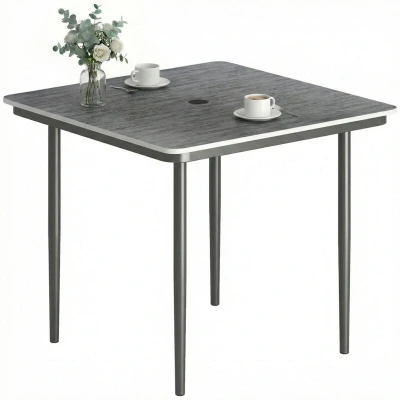 Outside table gatherings often get cut short by unpredictable weather. It's disappointing when harsh sun or a sudden shower ruins a family meal outdoors. This Outsunny garden dining table provides a reliable solution. Faux wood top and robust frame resist the elements. The patio table with parasol hole allows you to add shade. Enjoy your outdoor moments with this convenient outdoor dining table, creating lasting memories with ease. Specifications: ● Colour: Dark Grey ● Material: Metal, Plastic Wood Composite ● Overall Dimension: 85L x 85W x 72.5H cm ● Umbrella Hole Size: Φ40 mm ● Compatible Pole Size: Φ38 mm ● Maximum Load: 50 kg ● Item Label: 84G-908V00CG Features: ● Square outdoor dining table comfortably seats four for intimate gatherings ● Faux wood surface offers timeless style with low maintenance ● WPC plastic tabletop is weather-resistant and easy to clean ● Garden table with parasol hole to fit a standard 38 mm umbrella ● Powder-coated metal frame outdoor table holds up to 50
