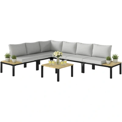 Garden sofa set arrangements feeling restrictive and uncomfortable? Your outdoor space deserves more than a rigid setup. Elevate your relaxation with the Outsunny garden patio set. Its modular design adapts to any occasion, while thick 10 cm cushions offer cloud-like comfort. With integrated side tables, your drink and book are always within reach. This conservatory furniture set transforms your patio into a haven of convenience and elevated living Specifications: ● Colour: Black, Light Grey, wood-effect ● Material: Steel, Metal, Polyester, Sponge, PP cotton ● Overall Dimension: 284L x 222W x 68H cm (L-shape) ● Loveseat Dimension: 124W x 68D x 68H cm ● Chair Dimension: 62W x 68D x 68H cm (armless), 92W x 68D x 68H cm (with side table), 68W x 68D x 68H cm (corner) ● Table Dimension: 62W x 62D x 34H cm ● Seat Dimension: 62W x 62D cm (single) 124W x 62D cm (loveseat) ● Seat Height: 32 cm ● Back Dimension: 45L x 38W cm ● Cushion Thickness: 10 cm (seat) 15 cm (back) ● Weight Capacity: 120