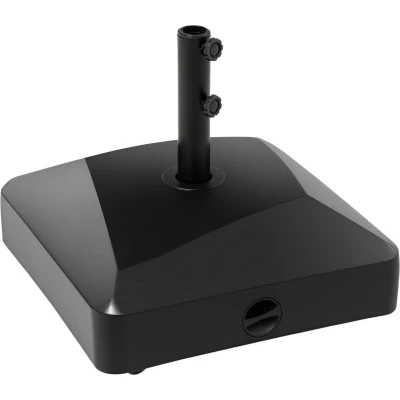 General description Ensure your parasol is always held firmly in place with this garden parasol base from Outsunny. Fill with water to weigh 43kg or sand for 60kg, or mix both together for extra weight. The shell is made from plastic for a strong and durable structure, featuring a filling port for easy filling and cleaning. This outdoor umbrella stand is perfect for use in the garden, patio, or any outdoor area. Technical specifications Colour: Black Material: PE, Metal Overall Dimension: 54.5L x 54.5W x 48H cm Bottom Base Size: 54.5L x 54.5W x 21.5H cm Pole Size: Φ5.6 x 44.5H cm Net Weight: 6.4kg After Filling Weight: 43kg (Water), 60kg (Sand) Fits Umbrella Pole: Φ3.8 cm, 4.8 cm Item Label: 84D-227V00BK Compatibility and accessories Suitable for Outsunny Parasol Parent SKUs: X-84D-031, X-84D-106 Installation Tightening knob to secure umbrella pole in place Usage Suitable for use in garden, patio, and outdoor areas
