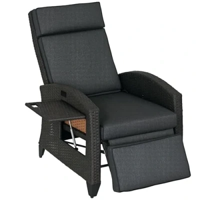 Sink in and relax to an angle you want outdoors, thanks to this Outsunny outdoor recliner chair. The back goes back to a maximum 140° angle. The padded cushion allows you to sink in comfortably. With a powder coated steel frame, this rattan recliner will support you properly, complete with a handy flip-up side tray. Specifications: ● Colour: Dark Grey Cushion, Brown Rattan ● Materials: PE Wicker, Steel, Polyester, PP Cotton, Sponge ● Overall Dimension: 65W x 78D x 102H cm (upright), 146L x 65W x 69H cm (reclining) ● Side Tray Size: 33L x 23W cm ● Backrest Size: 87L x 49W cm ● Seat Size: 54W x 55D cm ● Weight Capacity: 160 kg ● Item Label: 867-189V70CG Features: ● Adjustable back and lift-up footrest ● Powder coated steel frame, wrapped in protective plastic wicker ● Soft cushioned seat, back, headrest and footrest for comfort. Fixes onto seat with fasteners ● Foam-filled cushions with zippers for easy cleaning and soft seating ● Lift-up side tray is handy ● Assembly required