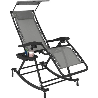 Outsunny Garden Rocking Chair Folding Recliner Outdoor Adjustable Sun Lounger Rocker Zero Gravity Seat with Headrest Side Holder Patio Deck Grey