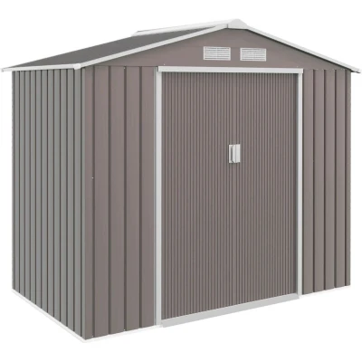 General description Keep your garden equipment and outdoor essentials locked away securely with this metal shed from Outsunny. Built from galvanised steel for strength, it features a lockable double sliding door for easy access and four vents to allow air circulation and prevent moisture buildup. The garden tool shed is finished with a protective weather coating and includes a foundation kit for stability on the ground. Technical specifications Colour: Grey Material: Galvanised Steel Overall Dimension: 213L x 130W x 185H cm Room Interior Dimension: 203L x 117W cm Sliding Door Size: 96L x 152H cm Vents Size: 22L x 10W cm Item Label: 845-030GY Installation Assembly required Three people are recommended for installation Estimated installation time: approximately three hours Always wear gloves during assembly Do not build during windy weather conditions Usage Spacious enough for storing all your outdoor tools, equipment, and gardening gear Sliding and lockable double door for easy access