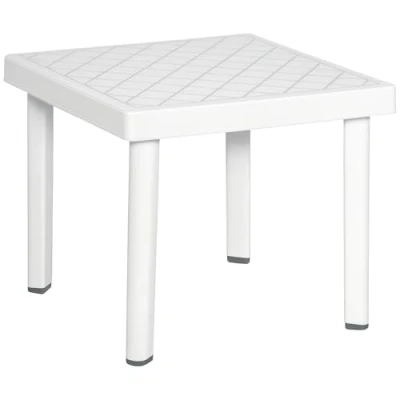 General description This outdoor side accent table from Outsunny is a stylish addition to any home garden décor. Enjoy the great outdoors with this multipurpose accent table, which provides a place to keep plants and flowers, as well as a spot for drinks and food while you relax outdoors. Whether you are enjoying a book, a cup of coffee, or a glass of wine, this outdoor table will keep your belongings steady while you unwind. Technical specifications Colour: White Material: PP Overall Dimension: 46.5L x 46.5W x 40.5H cm Table Top Width: 4.5 cm Weight Capacity: 20 kg Item Label: 84B-716 Other information Chic style to complement your patio, garden, and pool Can work as a coffee table, side table, flower stand, and more Plastic frame is tough and durable for long-lasting wear Footpads keep table balanced and stable Assembly required