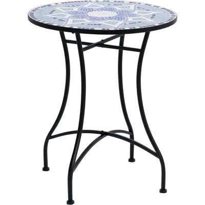 Outsunny Garden Table with Ceramic Top, Outdoor Mosaic Round Patio Side Steel Frame, 60cm Bistro Coffee for Balcony, Garden, Yard, Blue and White