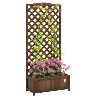 General description Give your flowers a beautiful place to grow and flourish with the Outsunny Garden Wooden Planter Box with Trellis. This tall and narrow design allows it to fit into smaller spaces with ease, while the solid wood construction ensures durability. The rear trellis is perfect for climbing vines or creating a decorative display, making this planter ideal for flowers, herbs, or as a decorative feature in your outdoor setting. Technical specifications Colour: Dark Brown Material: Fir wood Overall Dimension: 76L x 36W x 170H cm Planting Box Dimension: 76L x 36W x 30H cm Internal Planting Area: 71L x 31W x 24H cm Trellis Size: 76L x 2.5W x 140H cm Weight Capacity: 50kg Item Label: 845-635V01DR Usage Ideal for planting flowers, vegetables, and herbs Can be used as a decorative display area Perfect for outdoor living spaces Other information Assemble required Surface is coated with water-based paint, suitable for outdoor use