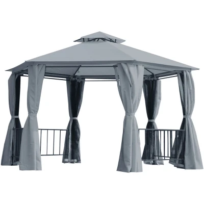 General description Find yourself in the protective cover of an Outsunny gazebo with sides and extend your outdoor enjoyment time. This garden pavilion offers a stable protective covering, making parties, weddings, and family gatherings enjoyable. The gazebo features 12 drain holes to prevent water pooling on top during rain, and the fabric is water, fade, and UV resistant for optimum protection. A powder-coated, rust-resistant steel frame ensures durability for years of use. Technical specifications Item Name: Gazebo Brand Name: Outsunny Material Used: Steel, polyester fabrics Colour: Grey, Black Hexagon side length: 1.97 m Top Height: 2.86 m Eaves Height: 2.05 m Side to Side: 3.31 m Box Dimensions: 174L x 62W x 14H cm, 212L x 34W x 13H cm Flat Pack: YES Assembly Required: YES Box Quantity: 2 Usage Ideal for parties, weddings, and family gatherings throughout the year. Provides protection against outdoor pests, sun, and wind. Other information Features a powder-coated, rust-resistant