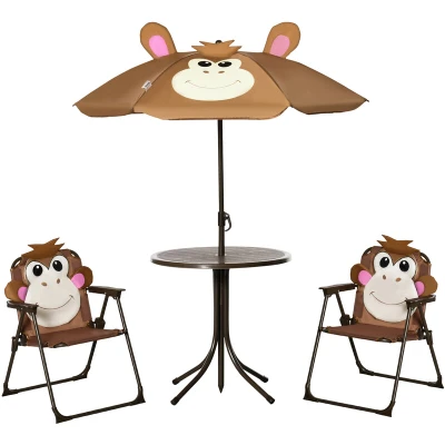 Outsunny Kids Bistro Table and Chair Set, Outdoor Folding Garden Furniture w/Monkey Design, Removable, Adjustable Sun Umbrella, Ages 3 6 Years Brown