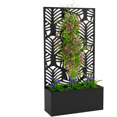 This Outsunny metal planter box is complemented with a back monstera leaves cut-out trellis: room for normal plants, flowers and vegetables, with space on the back for climbing vines. The 21 x 58 cm planter holds up to 29L soil, so it holds plenty. Made from powder coated metal, this is a tough piece suitable for outdoor use leave it standing or fix to a wall spot of your choice. Specifications: ● Colour: Black ● Material: Metal ● Overall Dimensions: 61L x 23W x 113H cm ● Raised Bed Inner Size: 58L x 21W x 24H cm ● Weight Capacity: 50 kg ● Item Label: 84H-519V00BK Features: ● Monstera leaves cut-out trellis for climbing vines ● 21 x 58 cm planter inner holds up to 29L soil. Plenty of room for plants and more ● Tough powder coated metal structure, suitable for outdoor use ● Can be mounted on the wall or used freestanding ● Maximum load 50 kg, assembly required