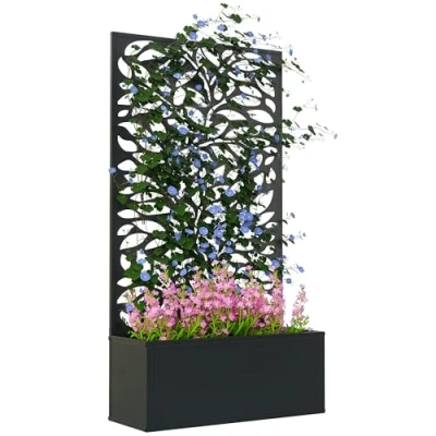 ManoManoTransform your outdoor space with the Outsunny metal planter, featuring a privacy panel with leaves cut-out motifs. This metal garden planter boasts a spacious 58L x 23W x 24H cm terior, great for nurturing plants in up to 50 kg of soil. Its versatile design allows for wall mounting or freestanding setups, making it a charming addition to any garden. Specifications: ● Colour: Black ● Material: Metal ● Overall Dimensions: 61L x 23W x 113H cm ● Planter Inner Size: 58L x 23W x 24H cm ● Weight Capacity: 50 kg ● Item Label: 84H-171V00BK Features: ● Privacy panel with leaves cut-outs serves as a trellis ● Inner space allows 50 kg of soil, ensuring lots of planting area ● Drainage slots prevent water accumulation, promoting plant health ● Can be mounted on the wall or used freestanding for versatility ● Metal construction with powder coating resists corrosion