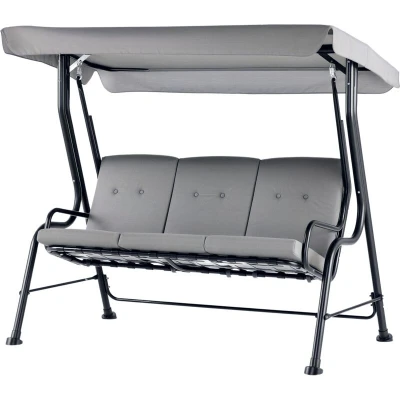 "Make the most of your outdoor space with the Outsunny three-seater garden swing chair. Spacious enough for friends or a serene solo retreat, it's your go-to for lazy afternoons. The adjustable canopy offers UV protection and enables you to find just the right shade as the sun moves. Crafted with a rust-resistant metal frame and anti-skid feet, it's built for stability while you unwind in padded comfort. Specifications: ● Colour: Dark Grey ● Material: Steel, Texteline Fabric ● Overall Dimensions: 200L x 120W x 172H cm ● Canopy Dimensions: 195L x 110W cm ● Seat Dimensions: 156W x 53D cm ● Cushion Dimensions: 119L x 54W cm ● Seat To Floor Height: 54 cm ● Weight Capacity: 270kg ● Item label: 84A-140V70CG Features: ● Three-seater design offers lots of space for relaxing with friends ● Adjustable canopy provides UV protection and customisable shade angles ● Rust-resistant steel frame ensures durability and long-lasting use ● Anti-skid feet pads add stability and protect floor surfaces ●