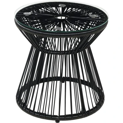 This Outsunny garden table is twist on your standard rattan designs: coming in a wicker string design, this is the great update for your outdoors. A powder coated metal frame means a strong core, with the large base ensuring balance. Comes with a 5mm tempered glass tabletop for a sleek and safe holding place. Specifications: ● Colour: Black ● Material: Steel, PE Rattan ● Overall Dimensions: Ф40 x 42Hcm ● Tabletop Dimensions: Φ40 cm ● Weight Capacity: 30kg ● Item Label: 867-119V00BK Features: ● Powder coated metal frame for a strong core ● Plastic rattan wicker for garden style, in a modern stringed design ● Tempered glass tabletop is easy to wipe clean ● Use as a coffee table, side table, flower stand and more ● Large base for balance, with protective feet ● Ready to use, no assembly required