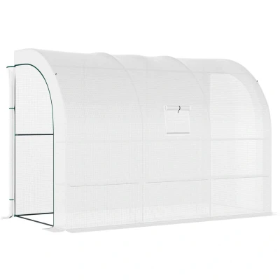 General description This Outsunny walk-in garden greenhouse is ideal for home gardening, providing essential protection for your plants to thrive. It features a sturdy frame and a durable PE cover that shields your plants and vegetables from the elements while allowing for proper ventilation through its window netting. This greenhouse ensures your plants remain happy and healthy throughout the year. Technical specifications Colour: White Material: PE cover, Steel Overall Dimension: 300L x 150W x 213H cm Window Size: 35W x 35H cm Door Size: 123W x 195H cm Wire Panel Size: 87L x 28.5W cm Weight Capacity: 10kg (Each Wire Panel) Windproof Level: 4 PE Cover: 140 g/m² Features Extends growing season and protects plants Designed for placement next to doors of homes, garages, barns, or sheds Reinforced powder-coated steel frame UV-resistant PE plastic cover allows sunlight to pass through 3-tier design with 6 wire panels for ample plant space Windows with netting for ventilation Accessible
