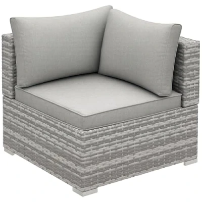 General description This modern rattan wicker corner sofa from Outsunny is a must-have design for your outdoor space. It features a sturdy galvanised metal frame that is tough and rust-resistant, ensuring durability. Wrapped in PE wicker, this sofa is suitable for outdoor use and comes with a padded seat and two thick cushions for added comfort. The cushion covers are removable and washable, promoting hygiene. Technical specifications Colour: Grey Material: Steel, Polyester Corner Sofa Dimension: 75W x 75D x 65H cm Seat Cushion Size: 67W x 67D x 8T cm Back Cushion Size: 67W x 45D cm, 50W x 45D cm Weight Capacity: 160 kg Item Label: 860-137GY Other information