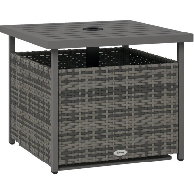 Style and function are blended into together with this outdoor table from Outsunny. It has three features: the tabletop, the under-table storage box and the umbrella hole. The hole fits parasols with 4cm diameters or less, keeping you protected as you relax. The box features rattan walls for style and offers convenient storage. The tabletop is made from powder coated steel for a solid and flat holding space. It'll make your time relaxing outdoor easy and stress-free this summer. Specifications: ● Colour: Grey ● Material: Steel, PE Rattan ● Overall Dimension: 55.5L x 55.5W x 46H cm ● Umbrella Hole Dimension: Φ40mm ● Weight Capacity: 30kg ● Item Label: 867-066V00GG Features: ● Recommended to use weights in box when parasol is in place ● Umbrella hole to hold a parasol for protection under the sun ● Table top is made from protective and tough powder coated steel ● Storage box is handy, with PE wicker wall panels to effortlessly blend in with your current garden furniture ● Maximum load