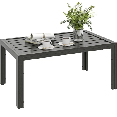 Enhance your outdoor home decor with the charming balcony table from Outsunny. The slatted tabletop combines aesthetic and practical, preventing water building up and quick drying for a comfortable using experience. The galvanised steel frame with a powder-coated finish ensures durability and can withstand various weather conditions. Let this rectangle garden table accompany you for enjoyable leisure time. Specifications: ● Colour: Grey Wood Effect ● Material: Galvanised Steel ● Overall Dimension: 101.5L x 61W x 46Hcm ● Weight Capacity: 30kg ● Item Label: 84G-291V00CG Features: ● Large tabletop provides place for drinks and snacks ● Slatted tabletop prevents water buildup ● Powder coated galvanised steel frame ensures strong foundation ● Adjustable pads on the bottom feet to keep it stable ● Suitable for patio, balcony, terrace, garden and so on ● Easy assembly required