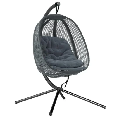 AmazonLarge seat: Large and generous egg chair gives you plenty of room to relax and take time out. Great for small and large gardens, balconies, outdoor porches - even some indoor spaces too. Foldable seat: Outdoor egg chair seat can be removable and folded - great for storage. Comfortable: 13cm thick padded cushion - sink in and relax. Back and seat cushion for the whole body. Cup holder so you don't have to move once you're seated and relaxed. Steel frame: Powder coated hanging stand keeps you supported. Long legs for balance. A safety tether prevents harsh swinging for calm relaxation. Dimensions: 172H x 118L x 103Wcm. Seat: 20H x 106L x 67Wcm. Maximum load 120kg. Easy to assemble.