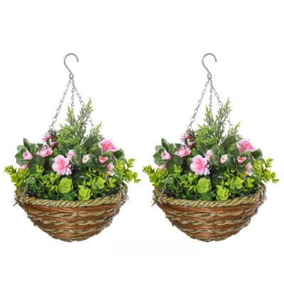 Outsunny Pack of 2 Artificial Lisianthus Flowers Hanging Planter with Basket for Indoor Outdoor Decoration