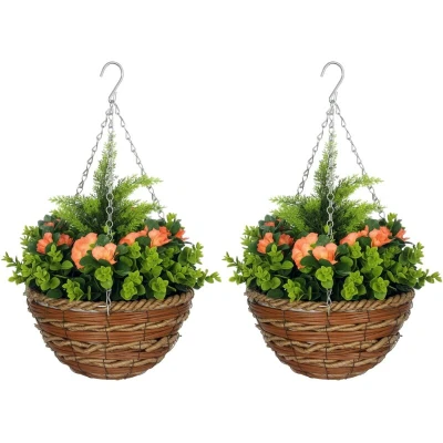 Outsunny Pack of 2 Faux Plant Artificial Lisianthus Flowers Hanging Planter with Basket for Indoor Outdoor Decoration, Orange
