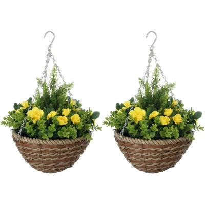 Outsunny Pack of 2 Faux Plant Artificial Lisianthus Flowers Hanging Planter with Basket for Indoor Outdoor Decoration, Yellow