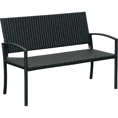 " Bring a new stylish feel to your outdoors with this bench from Outsunny. It's formed of a two layer design: a metal frame for a strong structure, wrapped with PE wicker for extra protection and durability. The black colour is stylish and blends in with other garden furniture easily. The two-seater design gives room to relax with a friend, finished with a high back and armrests for support. Minimal upkeep, with maximum comfort and delight. Specifications: ● Colour: Black ● Material Used: Metal, PE rattan ● Product Dimension: 122W x 60L x 85H cm ● Seating Dimension: 115L x 52W x 43.5H cm ● Weight Capacity: 240kg ● Net Weight: 9.5kg ● Assembly Required: YES ● Item label: 867-022 Features: ● Suitable for patios, porches, balconies, gardens etc. ● UV and weather resistant PE wicker will not fade or fray ● Easy to clean and maintain ● Foot pads to protect your floor ● High back and armrests for support ● Maximum load 240kg, assembly required "