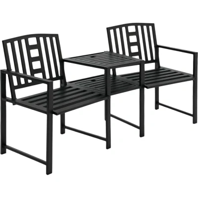 Outsunny Patio tete a Chair 2 Seat Bench Middle Coffee Table w/Umbrella Hole for Outdoors Decorative Slatted Design Steel Frame Black