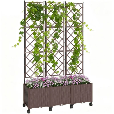 Outsunny Raised Garden Bed with Trellis offers a spacious planting area for flowers, vegetables and herbs. Equipped with a self-watering system and drainage holes, the raised bed for garden ensures plants stay hydrated without constant attention. The eight wheels, including four with brakes, provide easy mobility, letting you move the bed for optimal sunlight. PP material resists fading and warping, while quick tool-free assembly makes setup a breeze. Great for outdoor gardening all year round. Specifications: ● Colour: Brown ● Material: PP ● Overall Dimensions: 120L x 40W x 192H cm ● Planting Area Dimensions: 118L x 38W x 30H cm ● Trellis Dimensions: 116W x 149H cm ● Weight Capacity: 20 kg ● Item Label: 84H-597V00BN Features: ● Raised garden planter combined with a climbing trellis for vertical growth ● Built-in self-watering reservoir reduces frequent watering ● Drainage holes with plugs help prevent overwatering ● Eight smooth wheels make moving the planter easy ● Four lockable