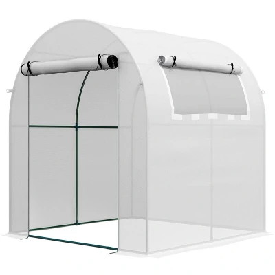 General description This Outsunny portable greenhouse is designed to extend your growing season, providing a perfect environment for your plants. Its spacious 6ft x 6ft size allows for ample plant arrangement, while the open design offers flexibility in setup. The greenhouse features a zipped roll-up door and side roll-up window for easy access and ventilation. Technical specifications Colour: White Material: Steel, PE Overall Dimensions: 180W x 180D x 200H cm Side Window Dimensions: 120W x 45H cm Door Dimensions: 123W x 158H cm PE Cover: 135 GSM Windproof: Level 4 (wind speed below 17.5 mph) Installation Includes guy ropes and ground stakes for securing to the ground. 10 cm long edges can be buried into the soil for added stability. Usage Provides UV and mild weather protection for plants. Roll-up doors and windows allow for easy access and ventilation. Arched roof design helps prevent water build-up.