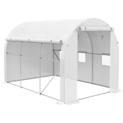 General description The Outsunny Polytunnel Greenhouse is an ideal solution for growing plants in various environments. With a spacious interior measuring 296 x 196 cm, it allows for flexible setup, making it perfect for adding shelves and racks for efficient organization. The greenhouse features a robust galvanised steel frame and a 140gsm polyethylene cover that protects your plants from mild weather conditions while promoting growth. Technical specifications Colour: White Material: Galvanised Steel, Polyethylene Overall Dimensions: 296L x 196W x 200H cm Door Dimension: 120W x 170H cm Window Dimensions: 35W x 35H cm Edging Width: 15 cm Windproof: Level 5 Item Label: 84H-009V01WT Compatibility and accessories Includes guy ropes and ground stakes for securing the structure to the ground Installation Easy to assemble; 2-3 people recommended for setup Usage Suitable for growing vegetables, flowers, fruits, and other plants Windows on both sides can be rolled up to allow fresh air in