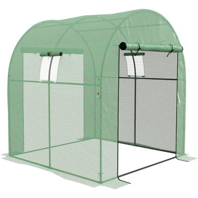 General description Small spots count for growing too, thanks to this Outsunny 1.8 x 1.8 x 2m greenhouse. The open inside allows you to set up the interior however you want, such as placing shelves for organization. The zipped doors ensure easy access, rolling up and staying in place, while mesh windows allow fresh air inside whenever needed. A steel frame provides a strong core, fitted with a protective plastic cover to shield against outside weather. It comes with ground stakes and guy ropes for securing to the ground. Technical specifications Colour: Green Material: Steel, Polyethylene Overall Dimensions: 180L x 180W x 200H cm Door Dimensions: 125W x 155H cm Side Window Dimensions: 34W x 34H cm Edging Width: 10 cm Windproof: Level 4 (wind speed below 17.5 mph) Item Label: 845-958V00GN Middle reinforcement grid for extra durability Extended cover edges to bury into soil Installation Two people are recommended for assembly. Usage Roll-up doors and mesh windows provide access inside