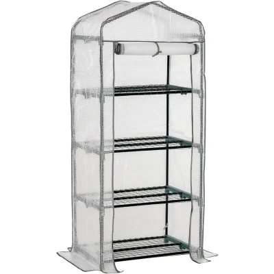 General description Protect and grow your plants in cold weather outside with this portable greenhouse from Outsunny. Made with a strong powder-coated steel frame, it features four inside shelves to keep your plants, herbs, and vegetables neatly displayed and organized. The transparent PE cover allows sunlight to reach the flowers and plants, and it is finished with two zips for quick and convenient access. It's ideal for those with little space, such as balconies and patios. Technical specifications Item Name: Greenhouse Brand Name: Outsunny Material: Steel Tube, PE Cover Net Weight: 4.5 kg Overall Dimension: 70L x 50W x 160H (cm) Tier Height: 35 cm Max Load (each tier): 15 kg Flat Pack: YES Custom Label: 845-228V01WT Other information PE cover to allow sunlight to your plants, flowers, and vegetables Protects plants from too much heat or cold and keeps out pests Portable and compact design that’s ideal for balconies and patios Sturdy powder-coated steel framing Rollable double