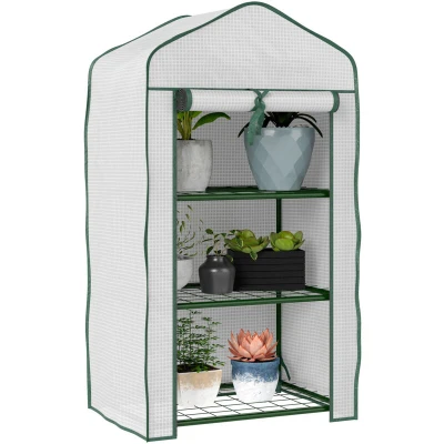 General description Grow plenty of plants, flowers, and vegetables wherever you want with the Outsunny Portable Mini Greenhouse. This mini greenhouse features a strong steel frame and a three-tier design that allows for organized mesh shelves, preventing liquid build-up and protecting the frame from damage. It is fitted with a durable three-layer plastic cover to safeguard the plants inside and includes a convenient roll-up door for easy access. Technical specifications Colour: White Materials: 140 gsm Polyethylene, Steel Overall dimensions: 59W x 39D x 127H cm Door dimensions: 43L x 99H cm Shelf dimensions: 57W x 37D cm Height of each shelf: 32 cm Max. recommended load: 5 kg per shelf Item Label: 84H-069V01WT Installation Assembly is recommended for 1-2 people. Usage Ideal for use in outdoor spaces, including corners and windowsills.
