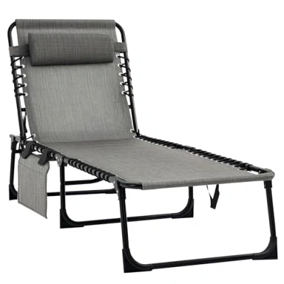 Outsunny Portable Sun Lounger, Folding Camping Bed Cot, Reclining Lounge Chair 5 position Adjustable Backrest with Side Pocket, Pillow for Patio Garden Beach Pool, Mixed Grey