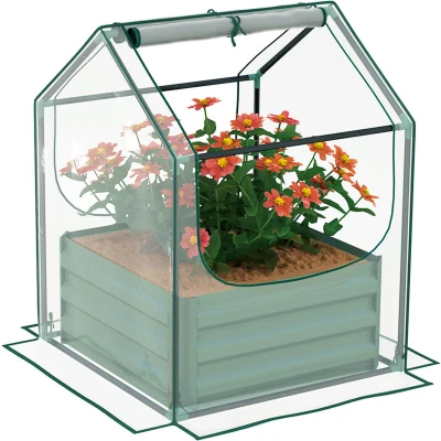 Double the growing power with this Outsunny outdoor planter. A steel garden planter base with top plastic cover: using together is best, but can be used separately. The steel base is galvanised for strength and suitability outdoors: the open bottom means no water build-up, as well as direct soil contact for best plant growth. The plastic cover creates a safe shield, complete with two windows for access and fresh air. Specifications: ● Colour: Clear and Green ● Material: Plastic, Steel ● Greenhouse Dimensions: 70L x 70W x 90Hcm ● Garden Bed Dimensions: 61L x 61W x 29.5Hcm ● Planting Area Dimensions: 59.5L x 59.5W x 29.5Hcm ● Window Size: 55W x 80Hcm ● Windproof Level: 4 ● Item Label: 845-971V02CR Features: ● Two-part design: bottom raised bed base and plastic greenhouse cover ● Plastic cover provides plant protection inside, also traps heat. 10cm edge to bury into soil ● Galvanised steel base creates safe shield for plants. Open bottom = direct contact with soil ● Two roll-up windows: