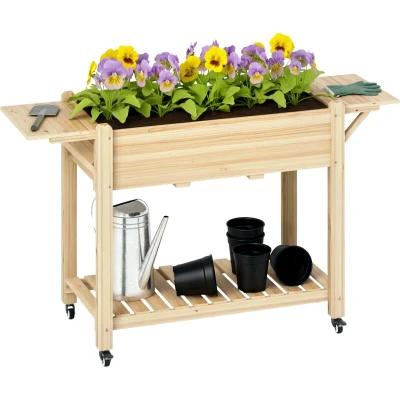Outsunny Raised Garden Bed, Wooden Elevated Planter Box with Lockable Wheels, Side Tables and Bottom Shelf, Outdoor Liner Drainage Holes for Vegetables, Flowers, Fruits, Natural