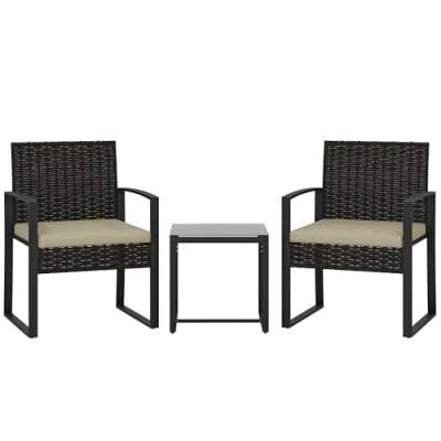 Garden bistro set for 2: Featuring two armchairs and a matching table, this garden set is perfectly sized for intimate conversations, peaceful reading, or sunset drinks with company. Create a chic corner at your balcony, patio, or porch Cushioned comfort: 25 D high-density sponge cushions make you feel thick, high-rebound and supported. Relax on the rattan garden chairs during weekends or unwind after a long day of work. Removable zipped covers make cleaning effortless All-weather durability: Textured plastic rattan wrapped on the steel frames gives the balcony furniture set a strong core and protective outer. Resistant to rust, mild weather elements and UV damage. Extend life with Outsunny garden furniture cover Tempered glass tabletop: A safe surface to keep drinks and snacks close to you. Spill coffee or snacks? No worries—just a quick wipe and your rattan garden furniture set looks as good as new, ready for your next relaxing moment Dimensions: Chair: 55W x 58D x 76H cm. Table: 40L x 40W x 40H cm. Seat: 48W x 48D cm. Seat height: 37 cm. Weight capacity: 120 kg (chair), 30 kg (table). Easy assembly required