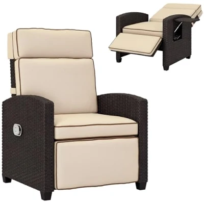 Forever on-trend rattan style, at an angle you want to relax - thanks to this Outsunny rattan recliner chair. The back reclines to a maximum 145° - paired with the manual footrest for full body relaxation. The wide seat is fitted with a padded seat cushion for plenty of comfort. It's complete with a flip-up side tray to keep items right next to you. Specifications: ● Colour: Dark Brown, Khaki ● Material: Steel, PE Rattan, Polyester, Vertical Cotton ● Overall Dimension: (Upright) 77W x 77D x 104H cm ● Max. Reclining Dimension: (145°) 148L x 77W x 64H cm ● Seat Dimension: 60W x 55D cm ● Seat Height: 35 cm ● Back Dimension: 69L x 58W cm ● Cushion Dimension: 147L x 60W x 7D cm ● Side Tray Dimension: 26LW x 24W cm ● Weight Capacity: 120 kg ● Item Label: 867-274V70KK Features: ● 145° reclining back, with footrest. Lie back and elevate your body comfortably ● Lift-up side table to keep items close to you ● A long padded seat cushion with headrest for comfort, with removable and washable