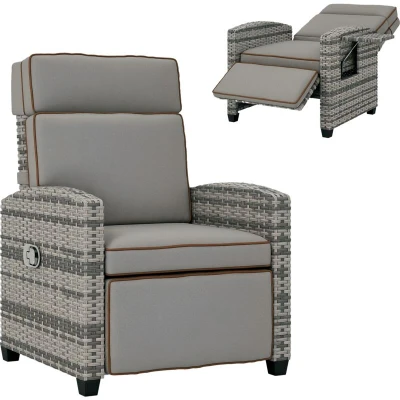 Forever on-trend rattan style, at an angle you want to relax - thanks to this Outsunny rattan recliner chair. The back reclines to a maximum 145° - paired with the manual footrest for full body relaxation. The wide seat is fitted with a padded seat cushion for plenty of comfort. It's complete with a flip-up side tray to keep items right next to you. Specifications: ● Colour: Mixed Grey, Grey ● Material: Steel, PE Rattan, Polyester, Vertical Cotton ● Overall Dimension: (Upright) 77W x 77D x 104H cm ● Max. Reclining Dimension: (145°) 148L x 77W x 64H cm ● Seat Dimension: 60W x 55D cm ● Seat Height: 35 cm ● Back Dimension: 69L x 58W cm ● Cushion Dimension: 147L x 60W x 7D cm ● Side Tray Dimension: 26LW x 24W cm ● Weight Capacity: 120 kg ● Item Label: 867-274V70GY Features: ● 145° reclining back, with footrest. Lie back and elevate your body comfortably ● Lift-up side table to keep items close to you ● A long padded seat cushion with headrest for comfort, with removable and washable cover