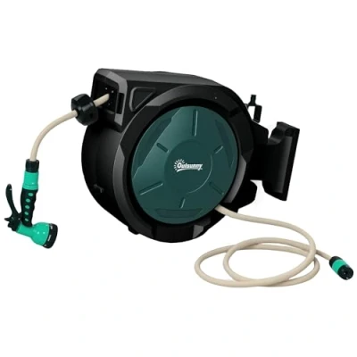 Outsunny Retractable Hose Reel Wall Mounted, 30+2m Garden Pipe with Lock, Auto Rewind, 7 in 1 Spray Nozzle, Includes Fixings, 180 Swivel, Outdoor Watering, 59 x 23 42 cm, Green