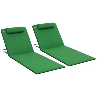 Outsunny Set of 2 Foldable Garden Beach Chair Mat Lightweight Outdoor Sun Lounger Seats Adjustable Back Metal Frame PE Fabric Head Pillow w/Carry Bag, Green