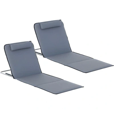 Outsunny Set of 2 Foldable Garden Beach Chair Mat Lightweight Outdoor Sun Lounger Seats Adjustable Back Metal Frame PE Fabric Head Pillow w/Carry Bag,Grey