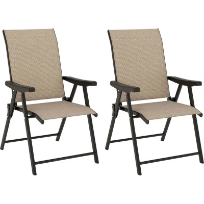 Outsunny Set of 2 Folding Chair, Garden Chair with Breathable Mesh Back and Seat, Outdoor Camping Chairs Armrests, Steel Frame for Deck Balcony, Brown