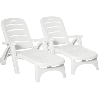 General description Our Outsunny patio folding lounge chairs are designed for ultimate relaxation and comfort. With a 5-position adjustable backrest, you can easily find your perfect angle for reading, sunbathing, or simply enjoying the outdoors. The chairs are foldable and equipped with wheels, making them easy to transport and store. Upgrade your outdoor experience with these stylish and functional chaise lounges. Technical specifications Colour: White Material: PP Overall Size (fully reclined): 187L x 76W x 49H cm Overall Size (upright): 140L x 76W x 93H cm Folded Size: 98L x 76W x 28H cm Seat Size: 57W x 113D cm Seat Height: 35 cm Backrest Size: 55W x 78H cm Armrest Size: 56L x 9W x 53H cm Net Weight: 13 kg Weight Capacity: 150 kg Item Label: 84B-687V01WT Usage The lounge chairs are ideal for various outdoor settings, including patios, beaches, parks, poolside, and gardens. They are easy to clean and require minimal maintenance, making them perfect for everyday use. Other